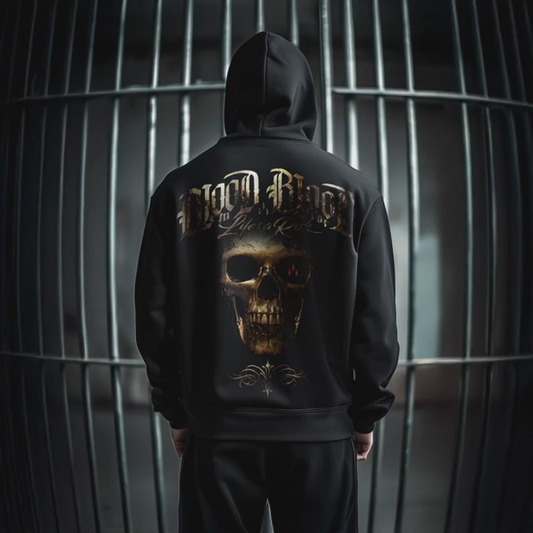 Der Gold Zip Hoodie Black besticht durch ein edles, kontrastreiches Rückenmotiv in goldener Optik, das Stilbewusstsein und Charakter ausstrahlt. Das hausgemachte Design hebt sich eindrucksvoll vom schwarzen Stoff ab und verleiht dem Hoodie einen modernen und hochwertigen Look.