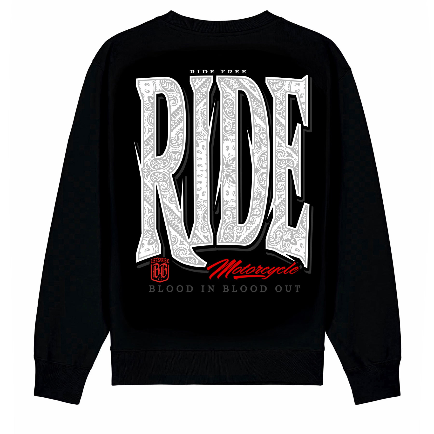 Das Ride Sweatshirt Black verbindet eine klare Optik mit einem markanten Backprint, der das dynamische Motorrad-Motiv wirkungsvoll hervorhebt. Auf der Vorderseite bleibt das Sweatshirt bewusst zurückhaltend, wodurch der große Rückendruck auf dem tiefschwarzen Stoff besonders gut zur Geltung kommt.