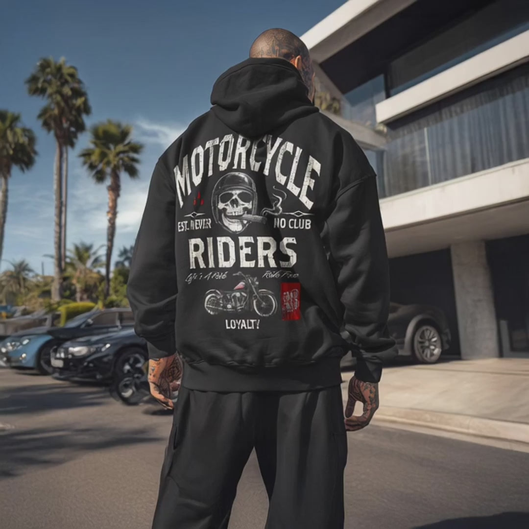 Der Riders Zip Hoodie Black überzeugt mit einem detailreichen Rückenmotiv, das Freiheit, Geschwindigkeit und Zusammenhalt symbolisiert. Das hausgemachte Design ist kontrastreich auf schwarzem Stoff umgesetzt und verleiht dem Hoodie einen markanten, modernen Look, der perfekt zu urbanem Streetstyle passt.