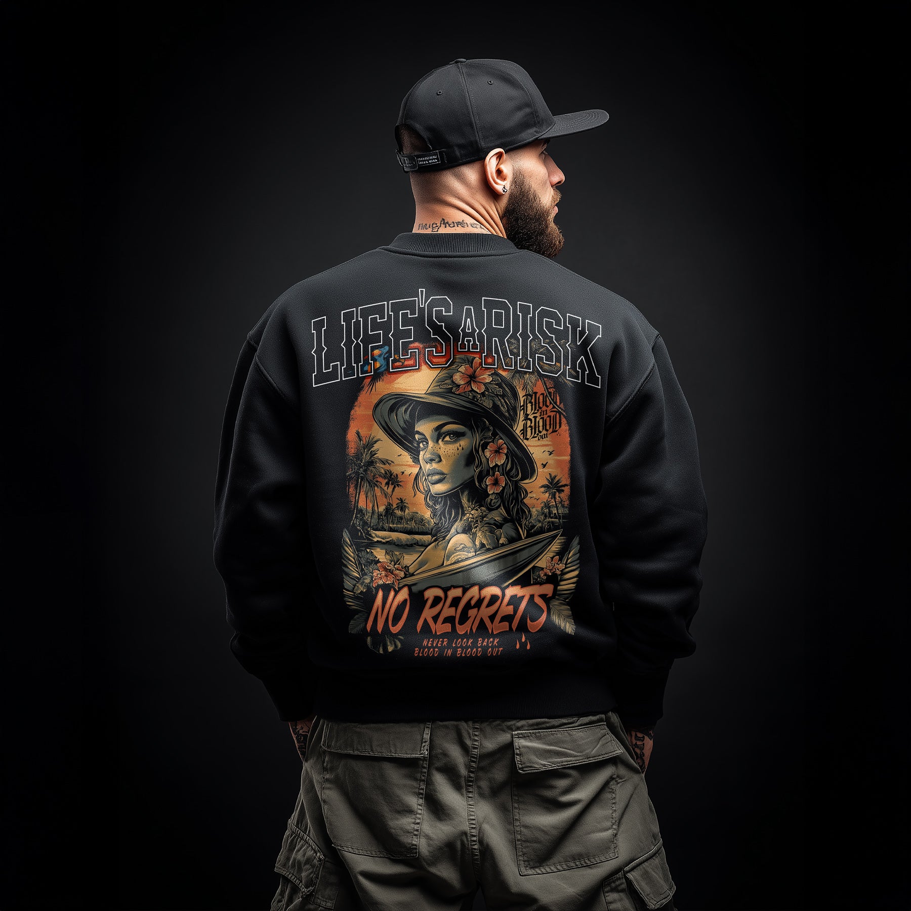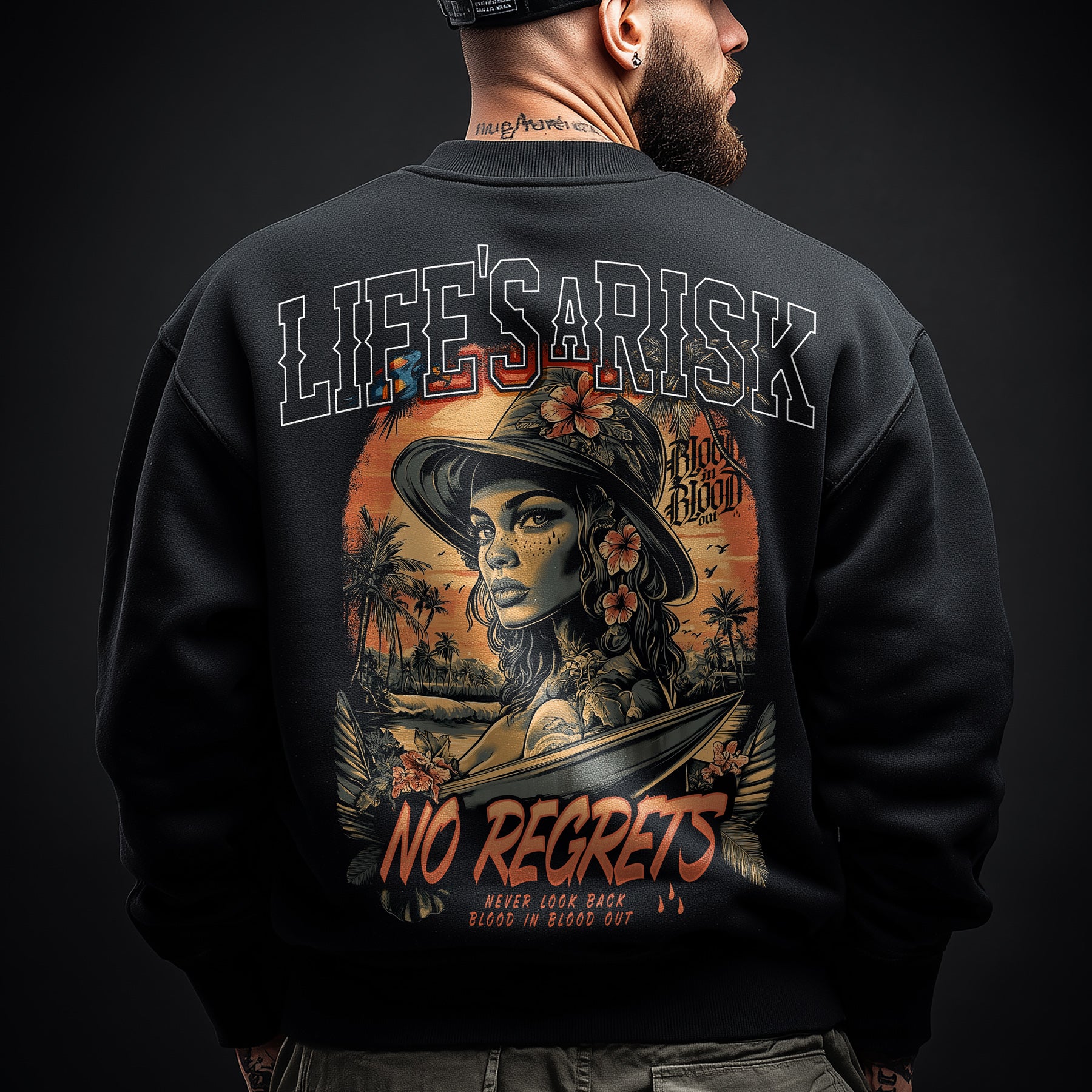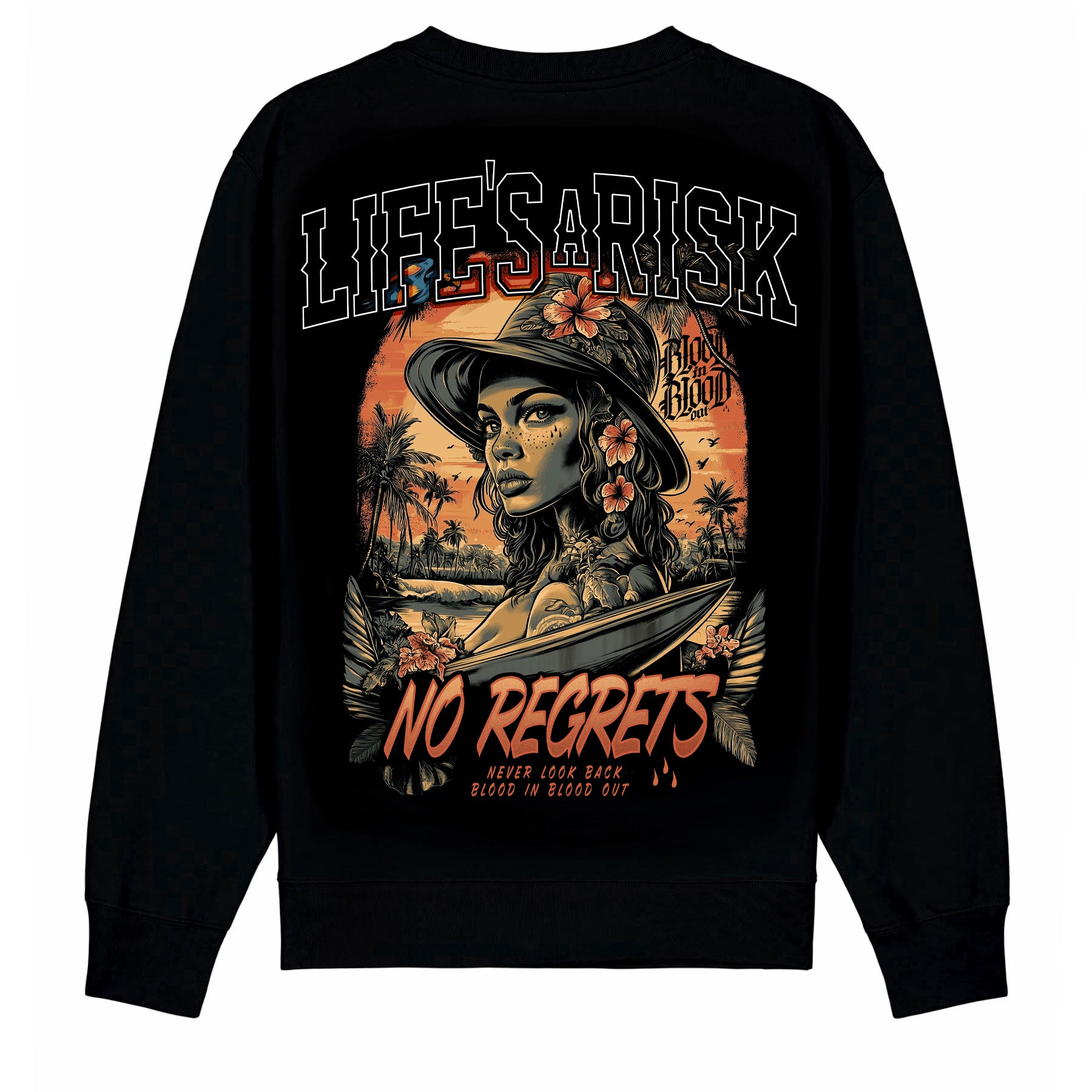 Das Tropic Heat Sweatshirt Black zeigt ein ausdrucksstarkes Motiv mit tropisch inspirierten Elementen, das sich kontrastreich vom schwarzen Stoff abhebt. Das hausgemachte Design kombiniert klare Linien mit einer dynamischen Bildsprache und sorgt für eine moderne, markante Optik.