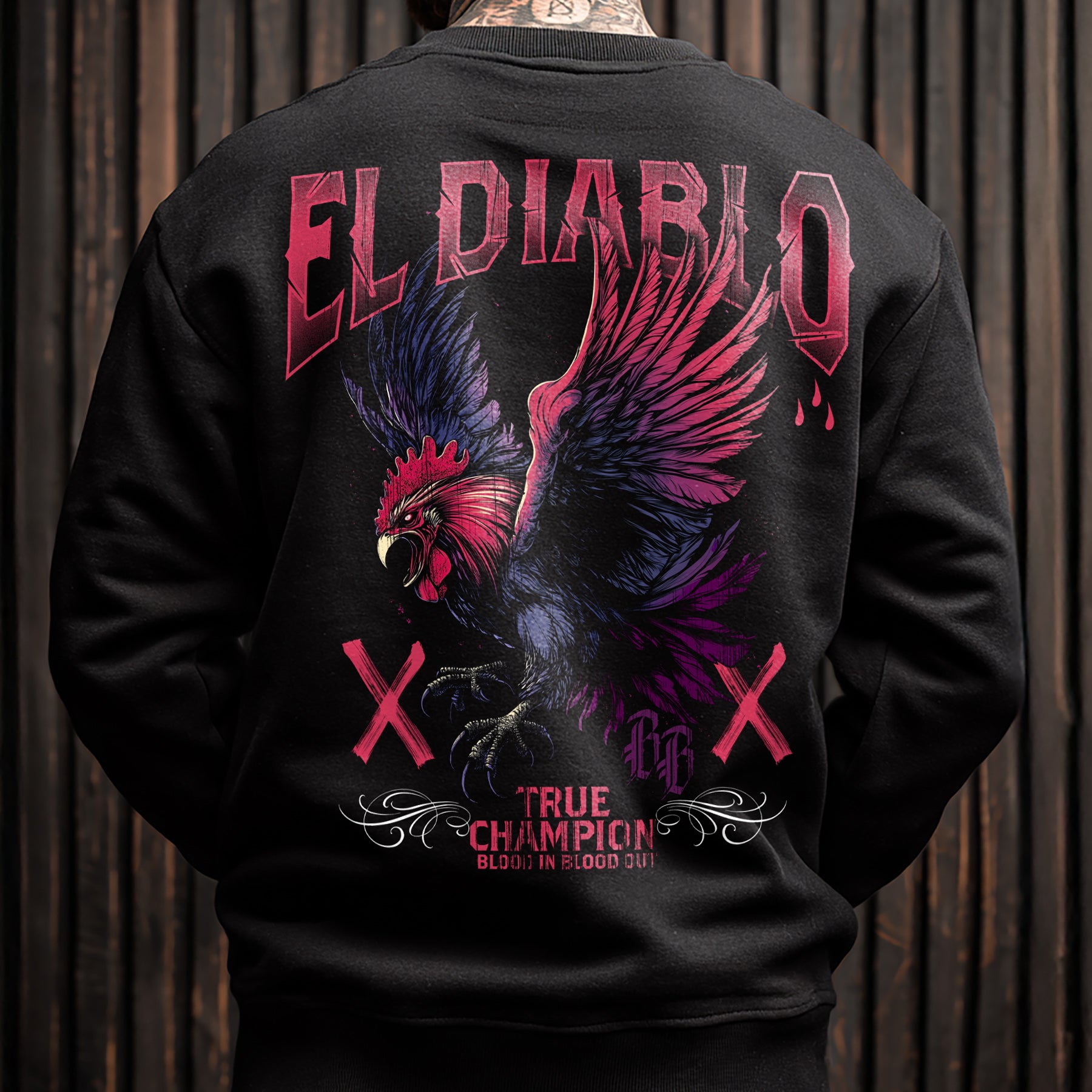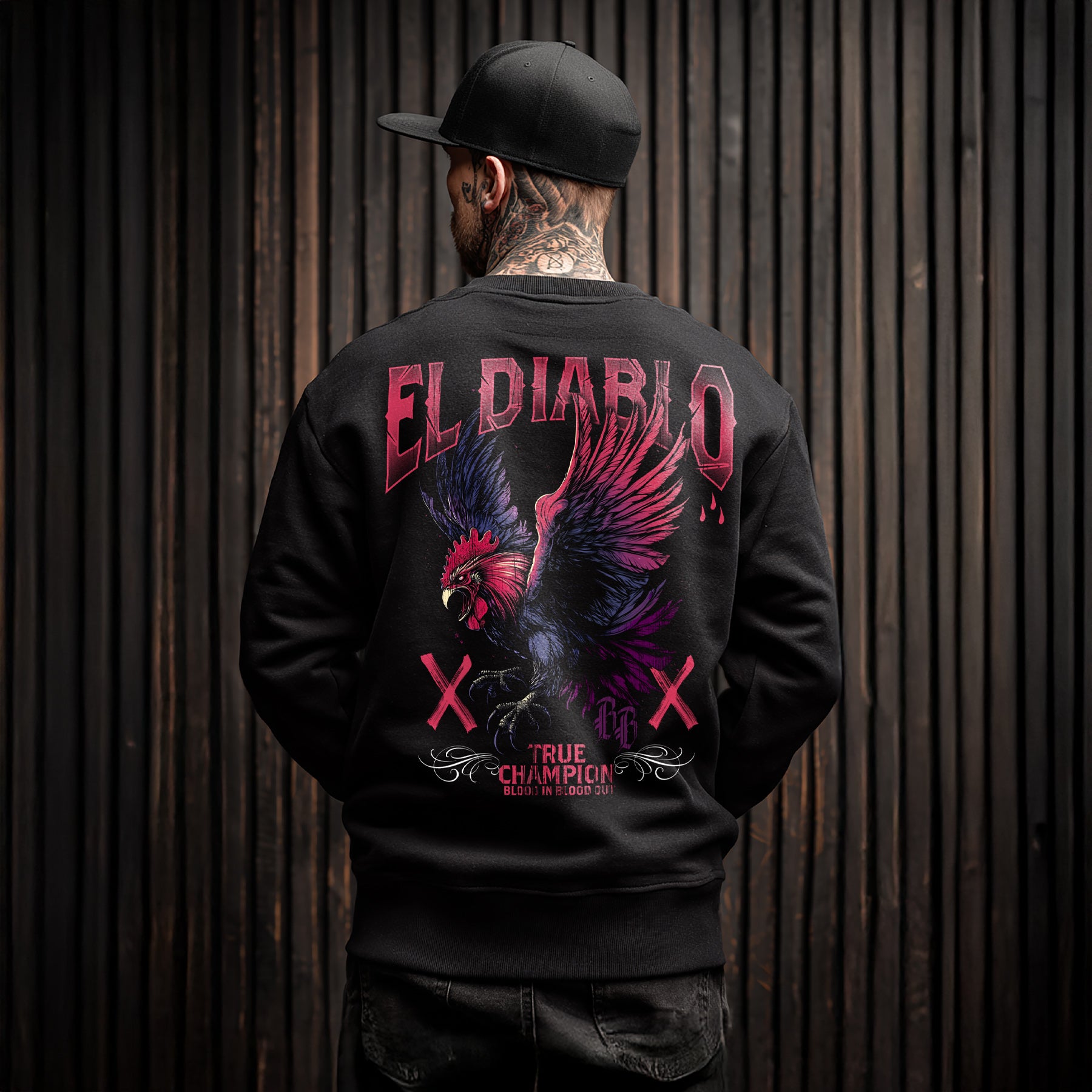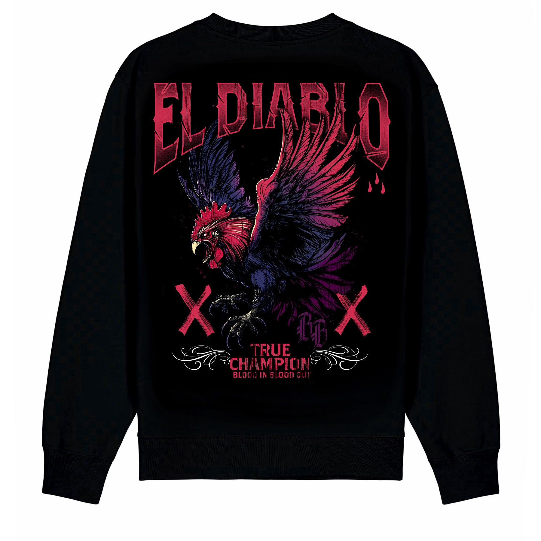Das El Diablo Sweatshirt Black zeigt ein markantes Motiv mit klarer, kontrastreicher Gestaltung. Die Grafik ist präzise ausgearbeitet und hebt sich deutlich vom schwarzen Stoff ab. Das hausgemachte Design verbindet klassische Symbolik mit moderner Streetwear-Ästhetik.