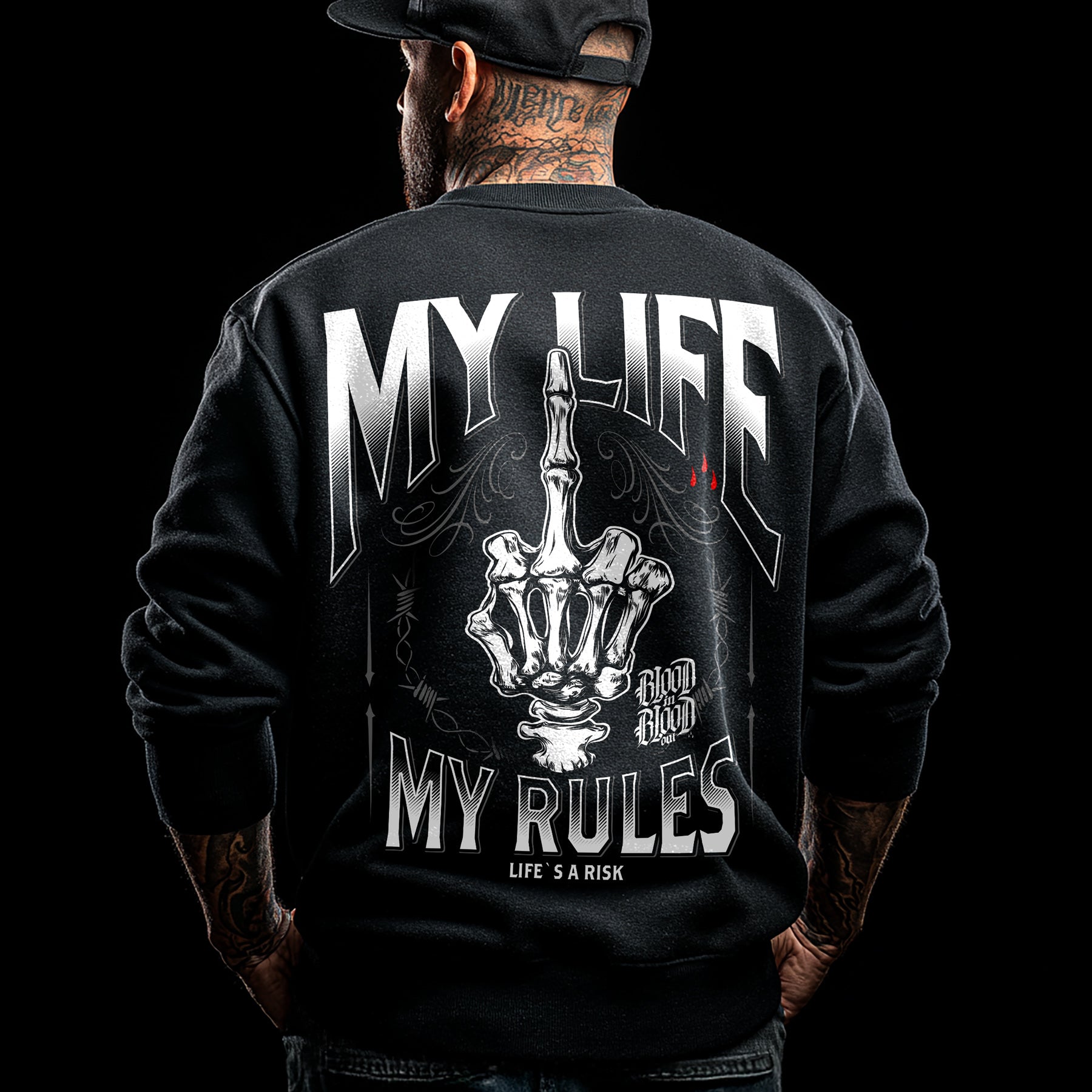 Das My Life Sweatshirt Black zeigt ein klares, ausdrucksstarkes Motiv, das Persönlichkeit und Haltung widerspiegelt. Das hausgemachte Design ist kontrastreich auf dem schwarzen Stoff umgesetzt und sorgt für eine moderne, reduzierte Optik mit starker visueller Wirkung.